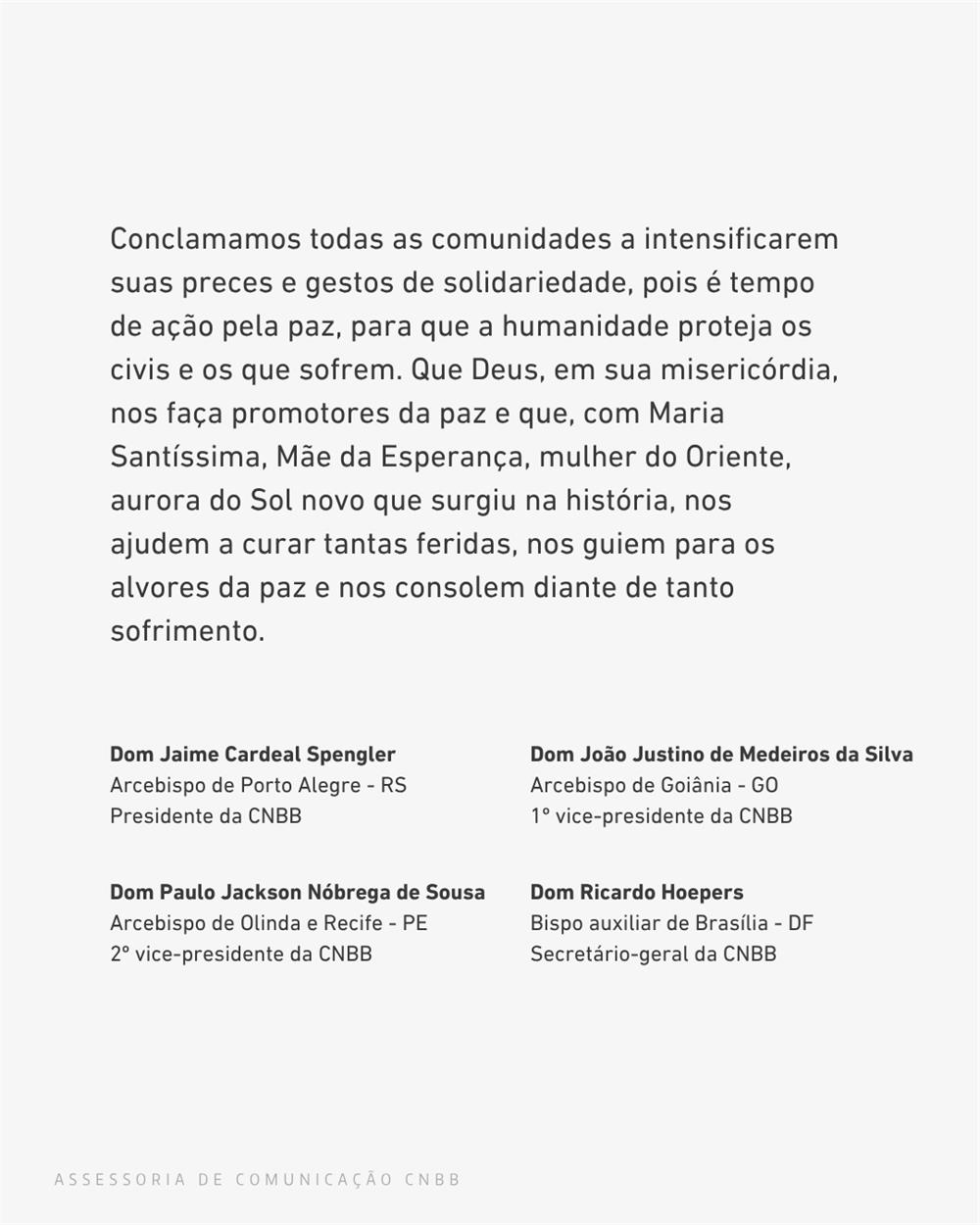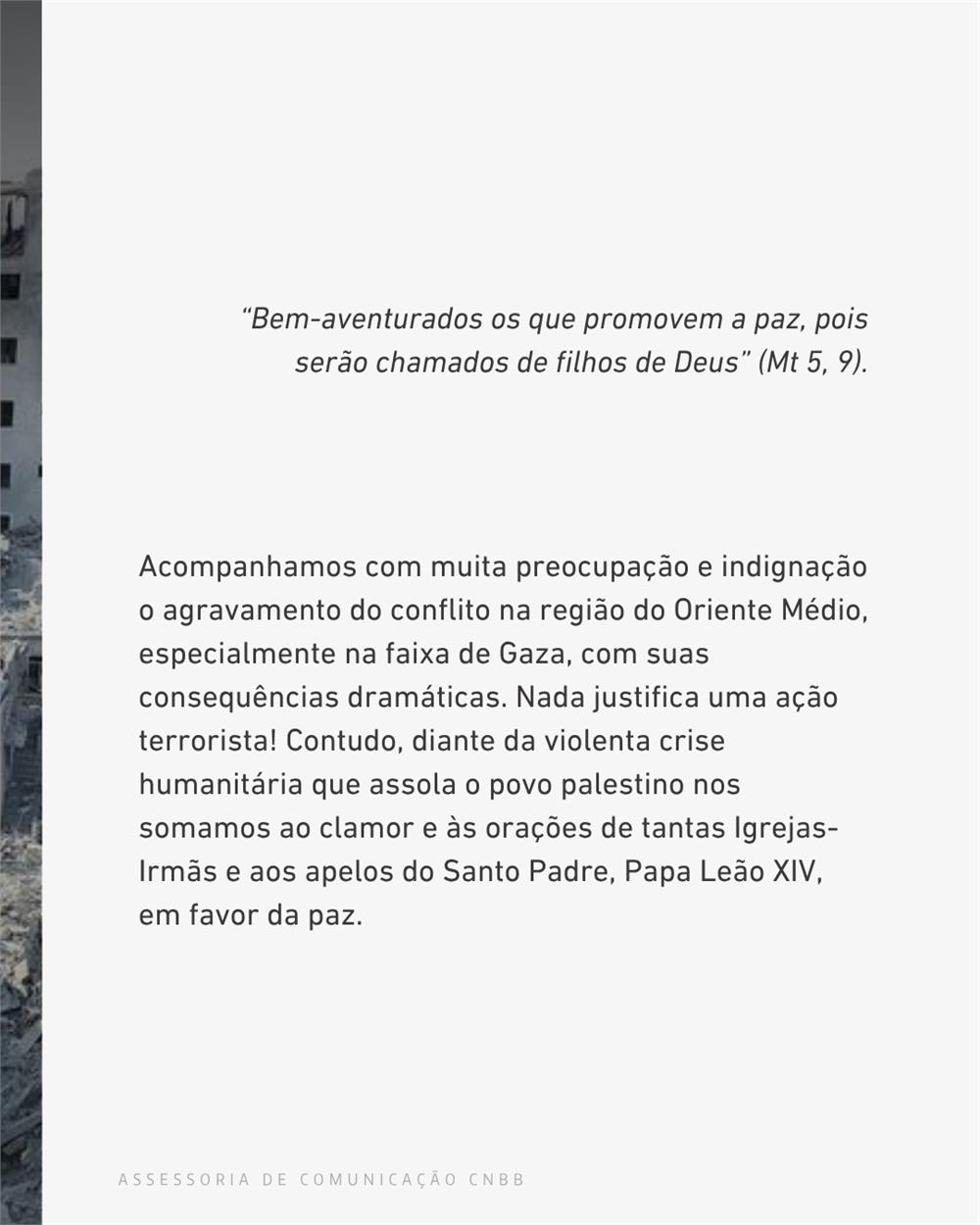 O texto se abre com as palavras do Evangelho de Mateus — “Bem-aventurados os que promovem a paz, porque serão chamados filhos de Deus” (Mt 5,9) — e reafirma com força que nenhuma ação terrorista pode ser justificada. Ao mesmo tempo, denuncia a gravidade da crise humanitária que atinge o povo palestino, ressaltando a necessidade de uma solução pacífica que permita a palestinos e israelenses conviverem sem violência.