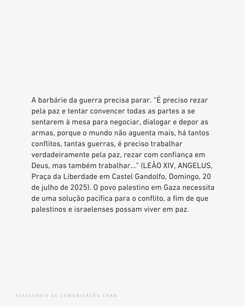 A nota cita o Ângelus pronunciado pelo Papa Leão XIV no último dia 20 de julho, em Castel Gandolfo, no qual o Pontífice afirmava: “É necessário rezar pela paz e buscar convencer todas as partes a sentar-se à mesa para negociar, dialogar e depor as armas, porque o mundo não aguenta mais, há muitos conflitos, muitas guerras; é preciso trabalhar seriamente pela paz, rezar com confiança em Deus, mas também agir…”.