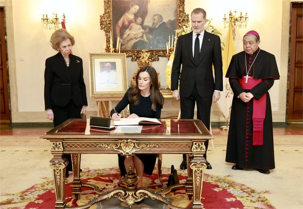 Madri – Terça-feira, 22 de abril de 2025, Suas Majestades o Rei Felipe VI da Espanha e a Rainha Letizia, acompanhados de Sua Majestade a Rainha Dona Sofia, dirigiram-se à Nunciatura Apostólica de Madri para apresentar pessoalmente suas condolências pela morte de Sua Santidade o Papa Francisco.