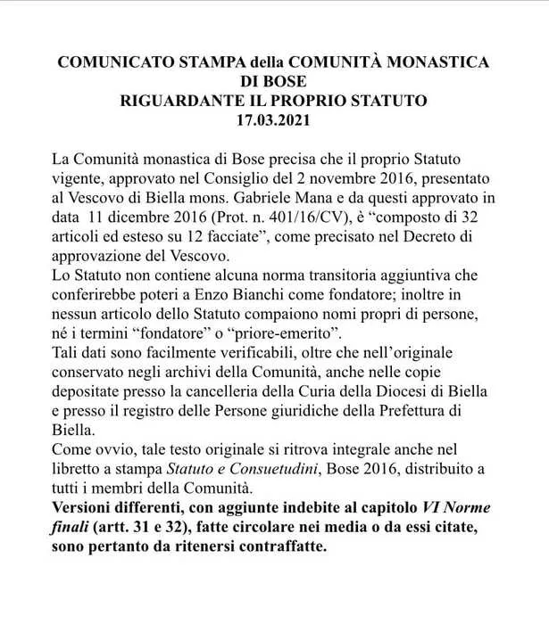 La vicenda trae origine nel marzo 2021, quando Silere non possum ha pubblicato lo statuto della comunità di Bose in questo articolo. Qualche giorno dopo, Guido Dotti, ha fornito informazioni false ai giornalisti dicendo che lo statuto era contraffatto e non era della comunità. Alcuni hanno scritto che lo statuto contraffatto era stato fatto circolare da Silere non possum. Purtroppo però, presto si sono dovuti ricredere, prendendo atto che quei documenti li aveva presentati lo stesso Dotti ad importanti istituzioni piemontesi al fine di ottenere benefici economici.