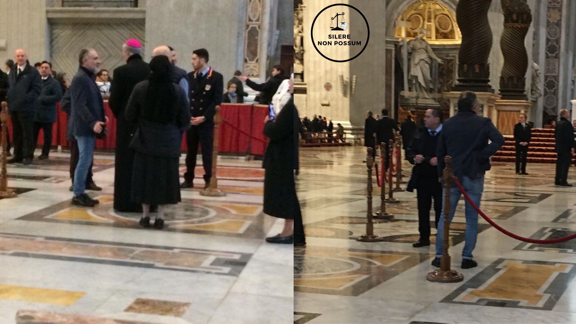 Il Papa Emerito è stato fatto accedere alla Basilica dall’ingresso laterale. Ingresso dal quale entrano anche le bare (chiuse) degli Eminentissimi Signori Cardinali. Ora, non si vuole utilizzare il portone riservato ai pontefici regnanti? Ce ne sono altri. Ha senso fare entrare il feretro di un Pontefice Emerito da un ingresso laterale dove si accede solitamente per andare a cambiarsi in Basilica? Inspiegabile. O meglio, la spiegazione c’è ed è quella che abbiamo spiegato in questi anni: Benedetto doveva sempre essere oscurato.