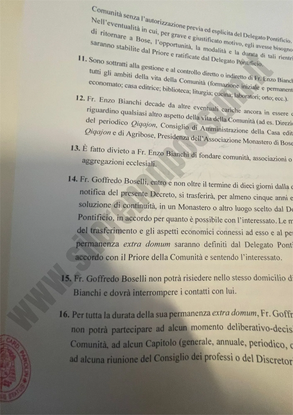 14. Fr. Goffredo Boselli, entro e non oltre il termine di 10 giorni dalla data di notifica del presente Decreto, si trasferirà, per almeno cinque anni e senza soluzione di continuità, in un Monastero o altro luogo scelto dal Delegato Pontificio, in accordo per quanto è possibile con l’interessato. Le modalità del trasferimento e gli aspetti economici connessi ad esso e al periodo di permanenza extra domum saranno definiti dal Delegato Pontificio in accordo con il Priore della Comunità e sentendo l’interessato.