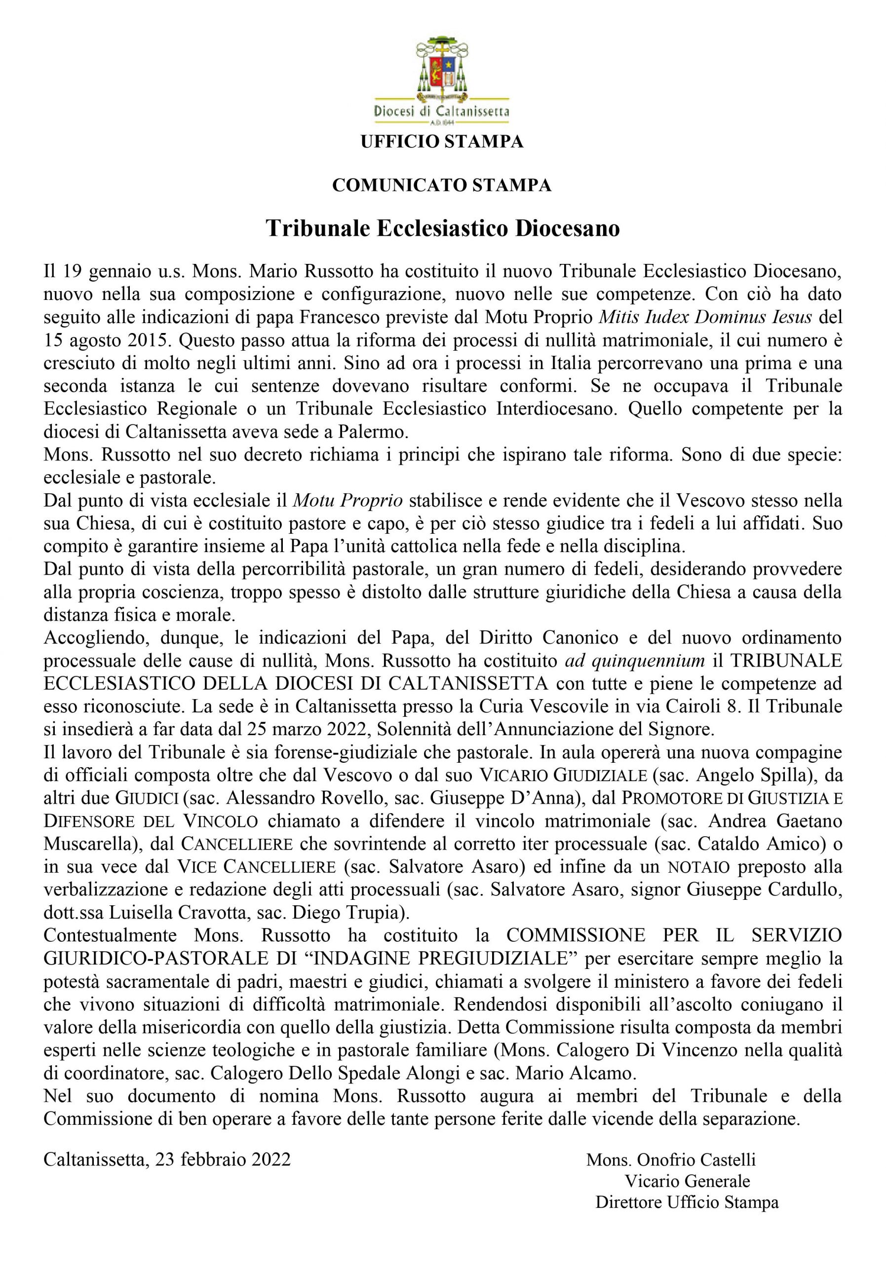 The diocese of Caltanissetta (Sicily) has established a new diocesan ecclesiastical court.