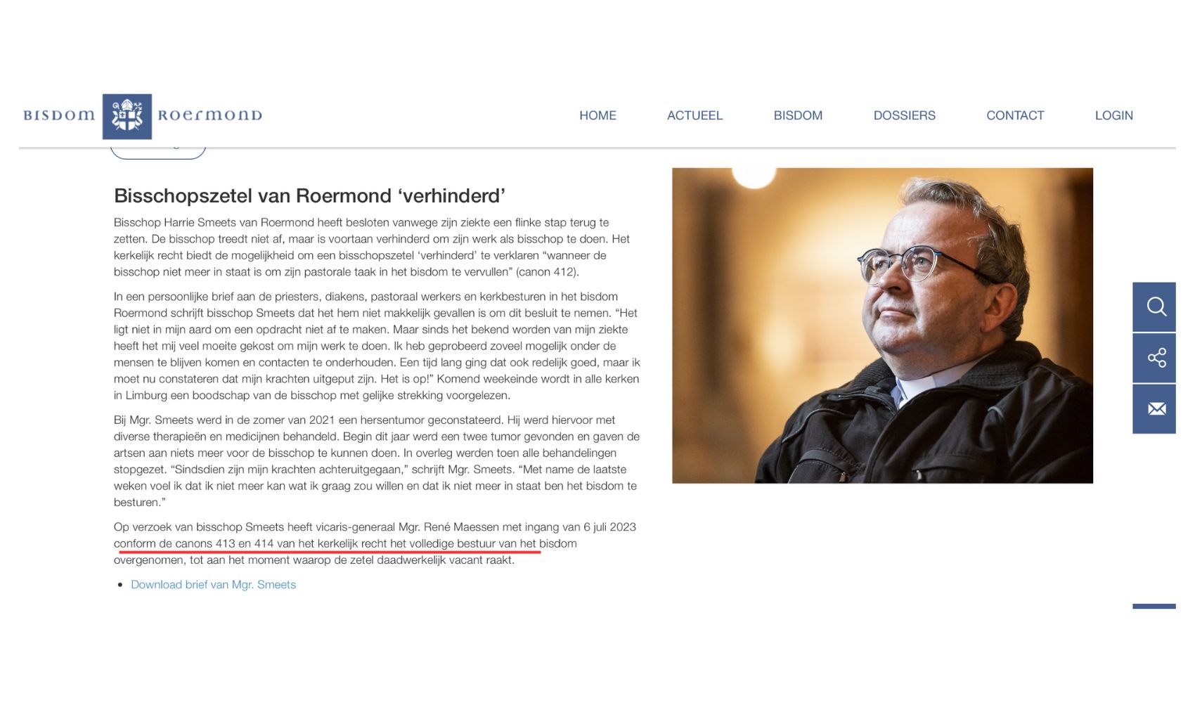 Rimarrò il vostro vescovo fino alla fine della mia vita, ma a causa della mia malattia sono impossibilitato a svolgere questo compito. Su mia richiesta e a mio nome, il Vicario Generale Mons. René Maessen ha assunto la piena amministrazione della diocesi, secondo le norme del diritto canonico, con effetto da giovedì 6 luglio 2023, fino a quando la sede sarà effettivamente vacante.