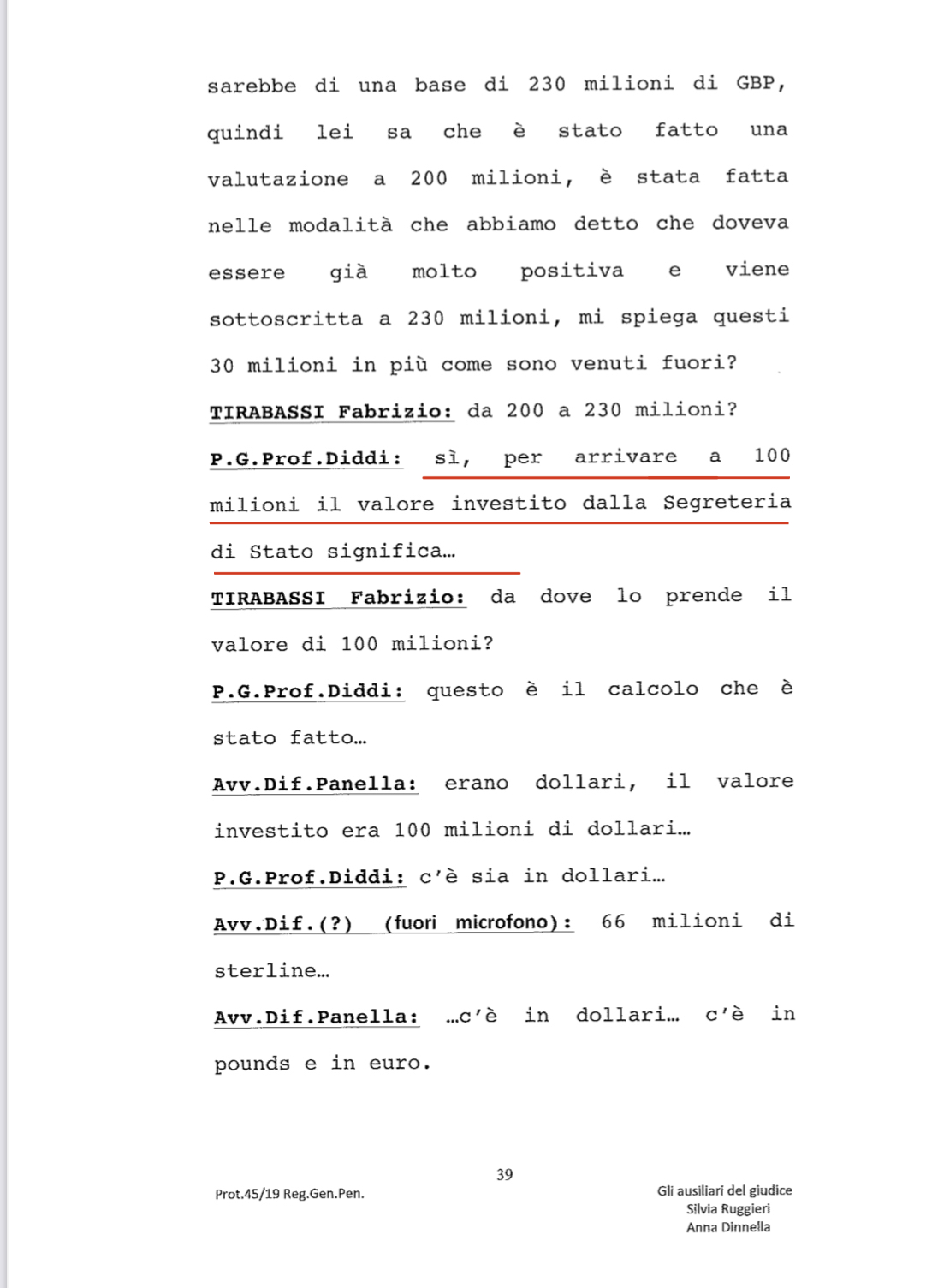 Ma cosa si intende per “incasso complessivo”? Dove è finito il mutuo? Si intende incasso al netto del mutuo? Dall’esame di Tirabassi condotto da Alessandro Diddì emerge che la Segreteria di Stato aveva versato 100 milioni di dollari (60 milioni di sterline) ma non aveva acquistato. A questa cifra vanno poi aggiunti quaranta milioni ( valore del NAV, cioè valore del fondo al netto dei debiti) dati a Raffaele Mincione. Nel 2018 ci fu un finanziamento da Cheyne capital di 123 milioni di sterline. Di tutto questo non si sa nulla. Nel frattempo l’avvocato Giovanni Maria Flick, il quale, come abbiamo visto nell’udienza del 28 febbraio 22, non ha ben chiara la differenza fra Sommo Pontefice e Santa Sede, si sarà sicuramente adoperato per presentare, nell’udienza di domani, tutta la documentazione inerente questa vendita. In modo che il Tribunale non apprenda questa notizia dai comunicati stampa ma ne possa avere contezza anche dagli atti e magari capire che fine hanno fatto tutti quei soldi.