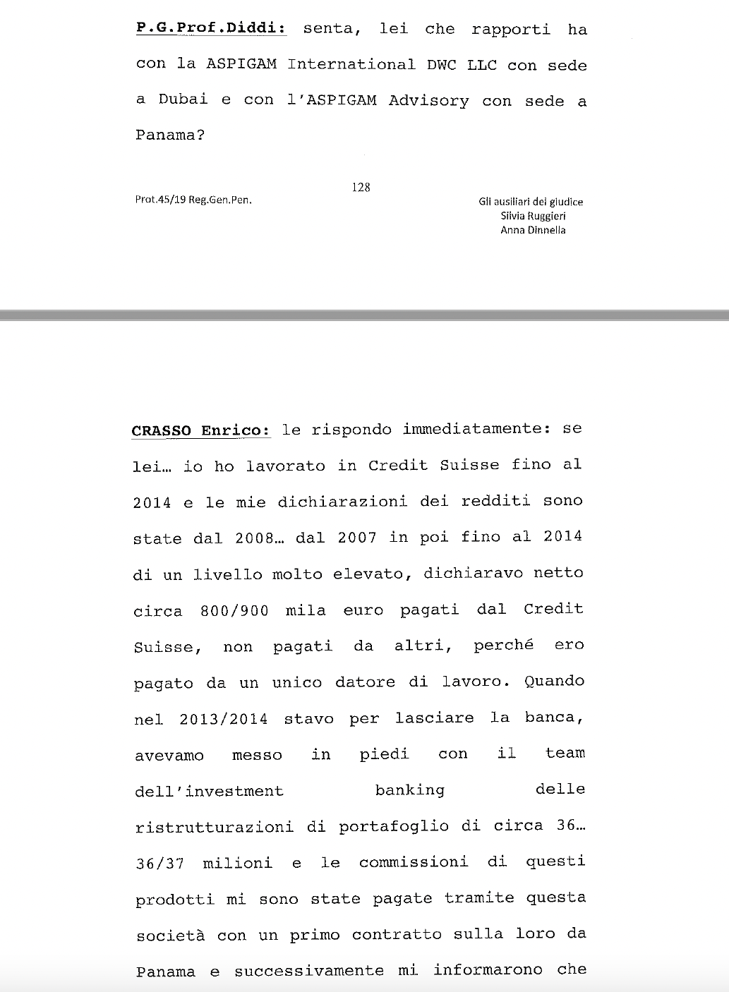 Enrico Crasso ha spiegato e dimostrato che si trattava di rapporti autonomi che Aspigam aveva con vari intermediari. Si trattava di commissioni da lui percepite a Dubai per prodotti finanziari strutturati. Nonostante Diddì abbia tentato in aula di tirargli fuori i nomi dei clienti, è ovvio che Crasso si sia avvalso della facoltà di non rispondere essendo questi dati coperti dal segreto professionale. Ha però chiarito che non si trattava della Segreteria di Stato. È lo stesso Ufficio del Promotore di Giustizia che riconosce che Divanda ha erogato molto più rispetto a quanto ha ricevuto da Athena.