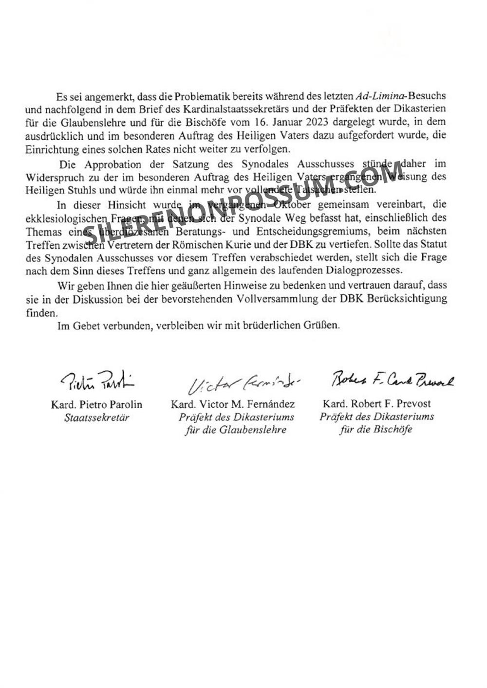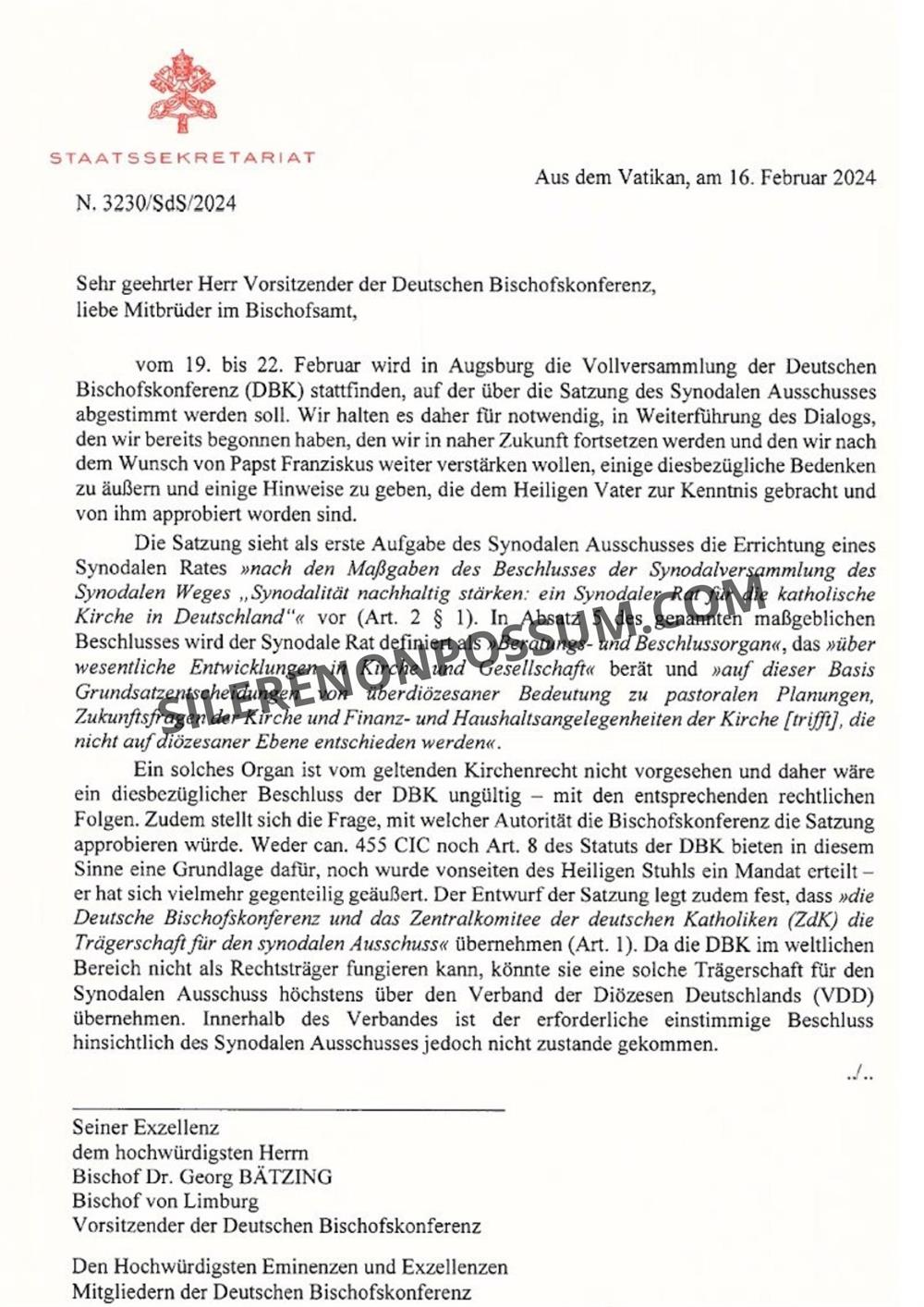 Con una lettera datata 16 febbraio 2024 il Segretario di Stato, il prefetto del Dicastero per i vescovi e il prefetto del Dicastero per la Dottrina della Fede hanno ribadito ai vescovi tedeschi che quest’organo “non è previsto dal diritto canonico vigente e pertanto una risoluzione in tal senso della DBK non sarebbe valida, con le relative conseguenze legali”.