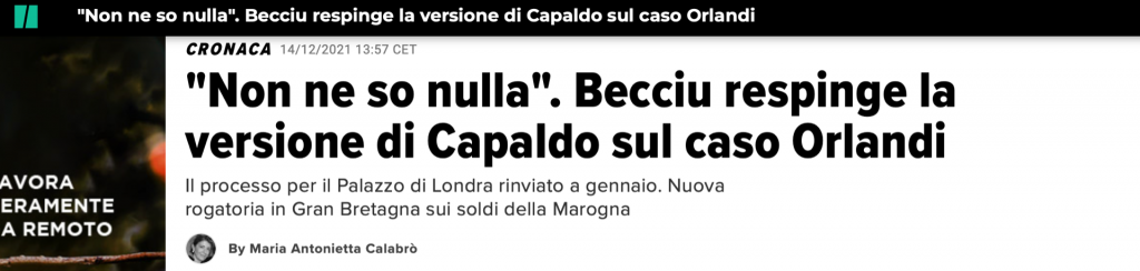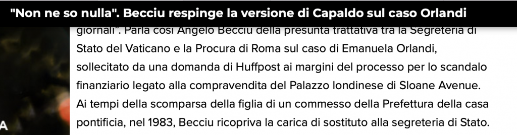 Ma le false informazioni non terminano qui. La giornalista volenterosa, afferma anche di aver chiesto al Cardinale Becciu, al termine dell'udienza ove è imputato, se sapesse qualcosa di quanto affermato dal magistrato Capaldo in prima serata. Quando il cardinale le dice che, ovviamente, non ne sa nulla, la signora tiene a fare un inciso: "Ai tempi della scomparsa della figlia di un commesso della Prefettura della Casa Pontificia, nel 1983, Becciu ricopriva la carica di sostituto della Segreteria di Stato". Assolutamente falso.