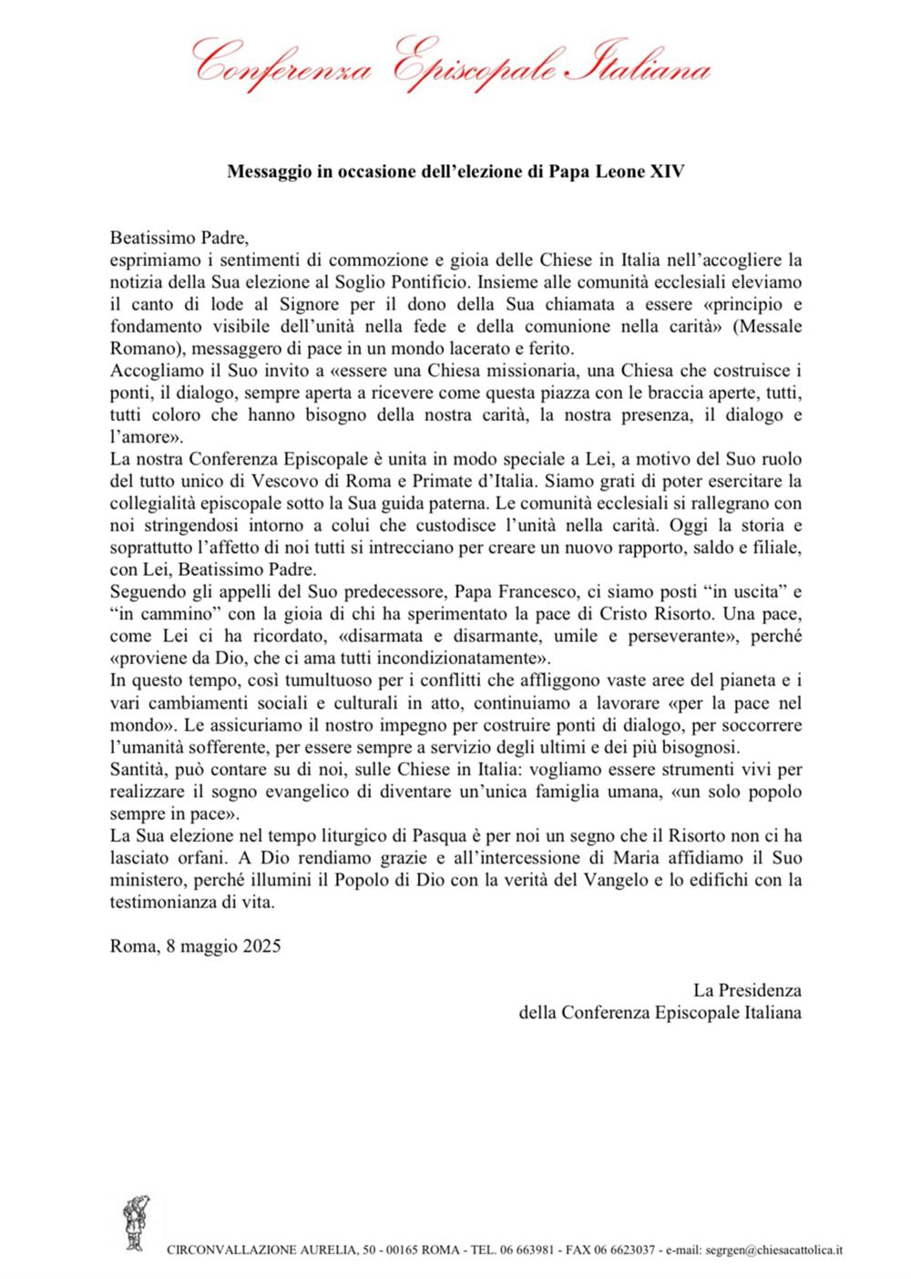 Città del Vaticano — Con un messaggio intriso di commozione, gratitudine e spirito di comunione ecclesiale, la Presidenza della Conferenza Episcopale Italiana ha voluto esprimere al nuovo Pontefice i sentimenti di gioia delle Chiese in Italia all’annuncio della sua elezione al Soglio di Pietro.