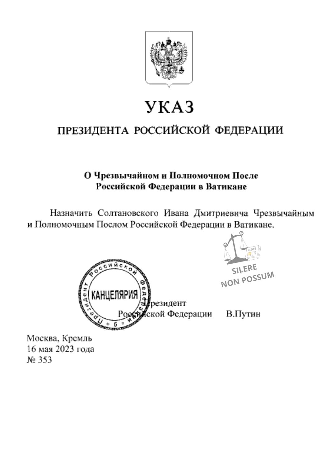 Il 16 maggio 2023 il Presidente della Federazione Russa Vladimir Vladimirovič Putin ha nominato S.E. Ivan Soltanovsky nuovo ambasciatore presso la Santa Sede.