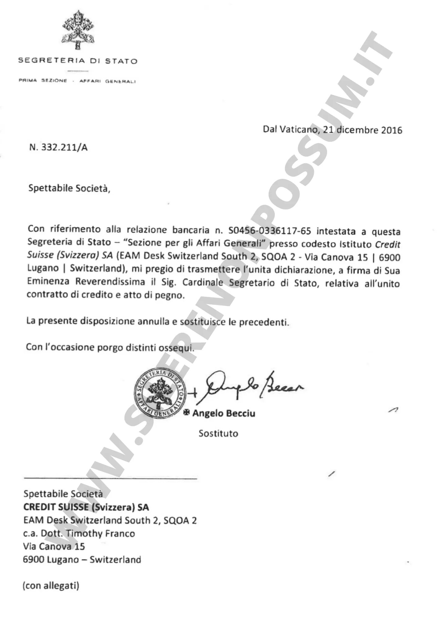 interrogato Enrico Crasso. Prima di guardare alle dichiarazioni rese dal finanziere che servì la Segreteria di Stato, dobbiamo fare due considerazioni in merito ad una notizia che è stata diffusa nelle scorse ore. A seguito dell'annuncio del nuovo Concistoro, nel quale sarà creato Cardinale anche S.E.R. Mons. Oscar Cantoni, è stato scritto che il Vescovo di Como avrebbe denunciato il suo confratello Angelo Becciu. Questo non corrisponde a realtà.