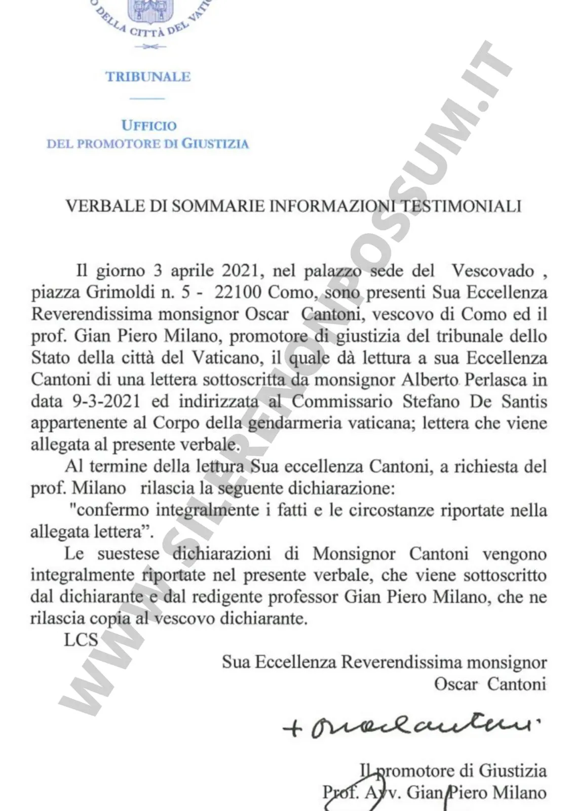 Perciò non si vede affatto quale sia il problema e non vi è prova alcuna di un colloquio fra Mons. Cantoni e il Cardinale dove quest'ultimo gli avrebbe detto: "Induci Perlasca a ritrattare sennò sono guai". Non è possibile neppure sapere cosa ha riferito il Vescovo di Como, per due motivi. Il primo è che il verbale di sommarie informazioni del 03 aprile 2021 è inutilizzabile in quanto il professor Giampiero Milano, illustre professore di diritto, si è dimenticato che l'attività investigativa che lui può compiere si arresta ai confini dello Stato della Città del Vaticano. Difatti, come possiamo verificare dal verbale qui sotto, questa attività istruttoria è stata compiuta dal Professor Milano nella Repubblica Italiana, ovvero a Como. Per fortuna i gendarmi dissero di non aver registrato nulla al Ristorante Lo Scarpone perchè non compiono attività in Italia, cit. (Qui l'audio dell'interrogatorio a Perlasca dove si parlò della questione.)