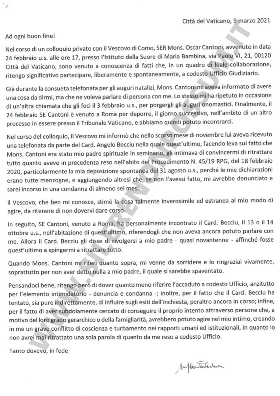 Il 24 febbraio 2021 il vescovo di Como si incontrò con Mons. Alberto Perlasca presso l'Istituto delle Suore di Maria Bambina. In quella occasione, Perlasca riferisce che Mons. Cantoni gli avrebbe riferito di pressioni fatte dal Card. Becciu al fine di farlo ritrattare innanzi ai Promotori di Giustizia. Questa è la considerazione di un uomo che si è contraddetto in più occasioni ed è emerso dal dibattimento che è stato "la manina" che ha permesso il flop dell'affaire Sloane Avenue. Ora è chiaro che personaggi come Alessandro Diddì e giornalisti sprovveduti possano credere a quest'uomo, o vogliano credere. Chi conosce gli ambienti ecclesiastici ha chiaro cosa possa essere avvenuto in quel momento. Innanzitutto il Cardinale Becciu è liberissimo di parlare con chi vuole e può anche minacciare azioni legali che sono del tutto lecite. Sicuramente Sua Eminenza avrà parlato con Mons. Cantoni (suo confratello) delle accuse che gli aveva mosso il Perlasca. Si sarà lamentato? Avrà espresso le sue perplessità? Tutto lecito. Gli avrà anche detto che sarebbe stato costretto a querelarlo per calunnia? Assolutamente lecito. Anzi, auspichiamo lo abbia fatto. Chissà se Alessandro Diddì indagherà....